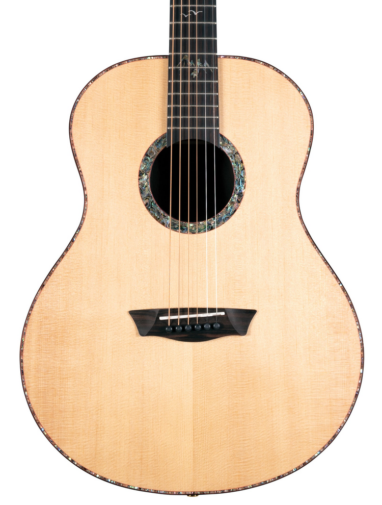 The Bella Tono Elegante S24S has everything an acoustic guitar player could ask for and then some. It features a Solid Spruce top and jaw-droppingly gorgeous Pau Ferro back & sides pairing. The soundboard is adorned with stunning abalone for both the rosette and purfling which is further accented with a rich Padauk highlight and Ebony binding. The Ebony fingerboard continues with the lush abalone appointments; depicting an inlaid scene of mountains and birds in flight. The Washburn Studio body design makes for an incredibly comfortable playing experience while managing to maintain the tight lows, focused mids and clear highs commonly associated with larger body sizes. The solid Spruce top helps define sonic nuances throughout the entire register of the instrument. Its full 25.5″ scale length extends an undeniable familiarity to the player and the satin finished, modern “C” profile of the Mahogany neck is smooth and cozy feeling in the hands.